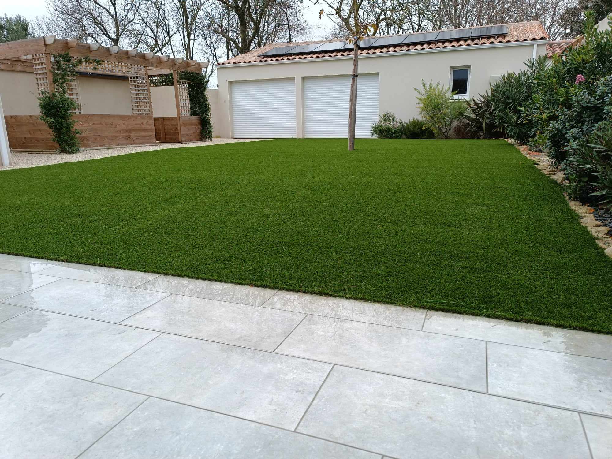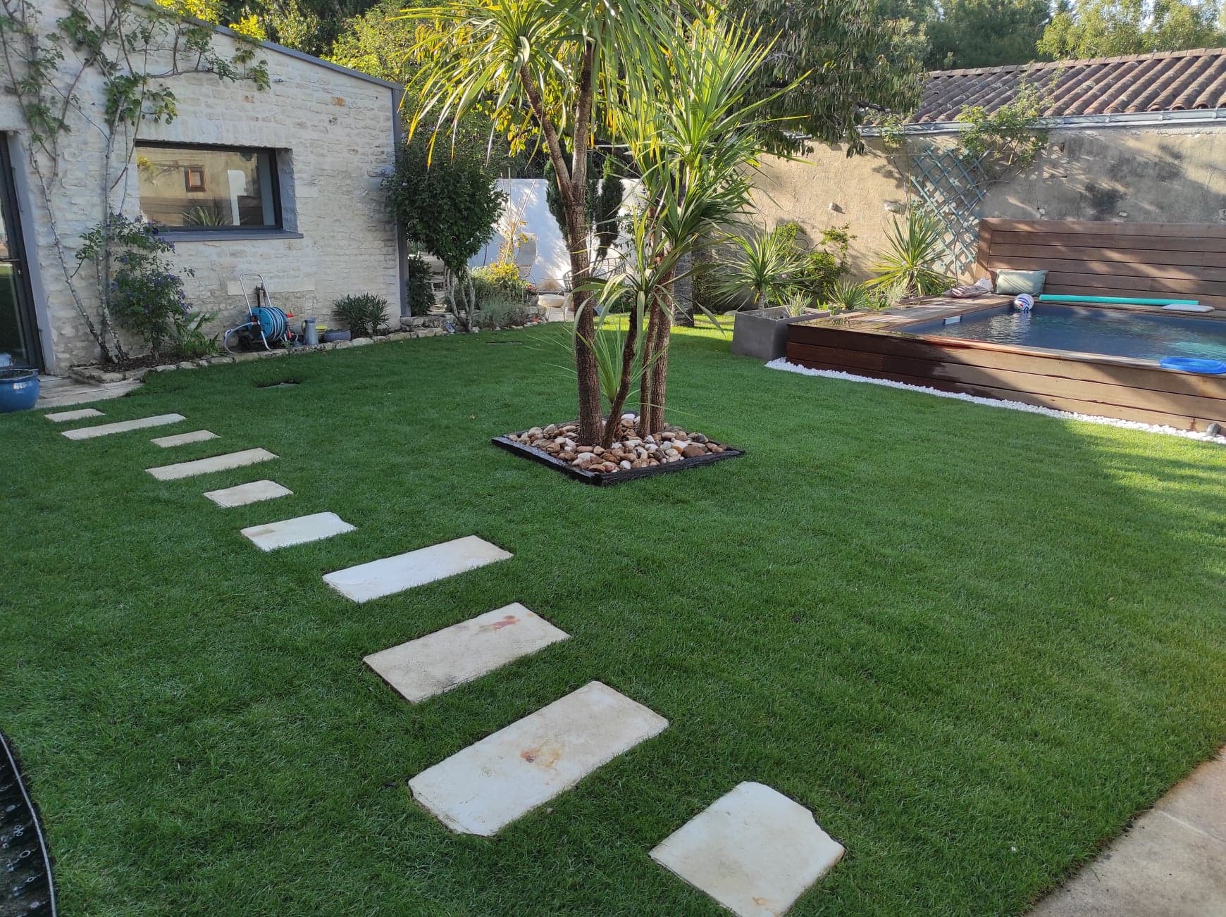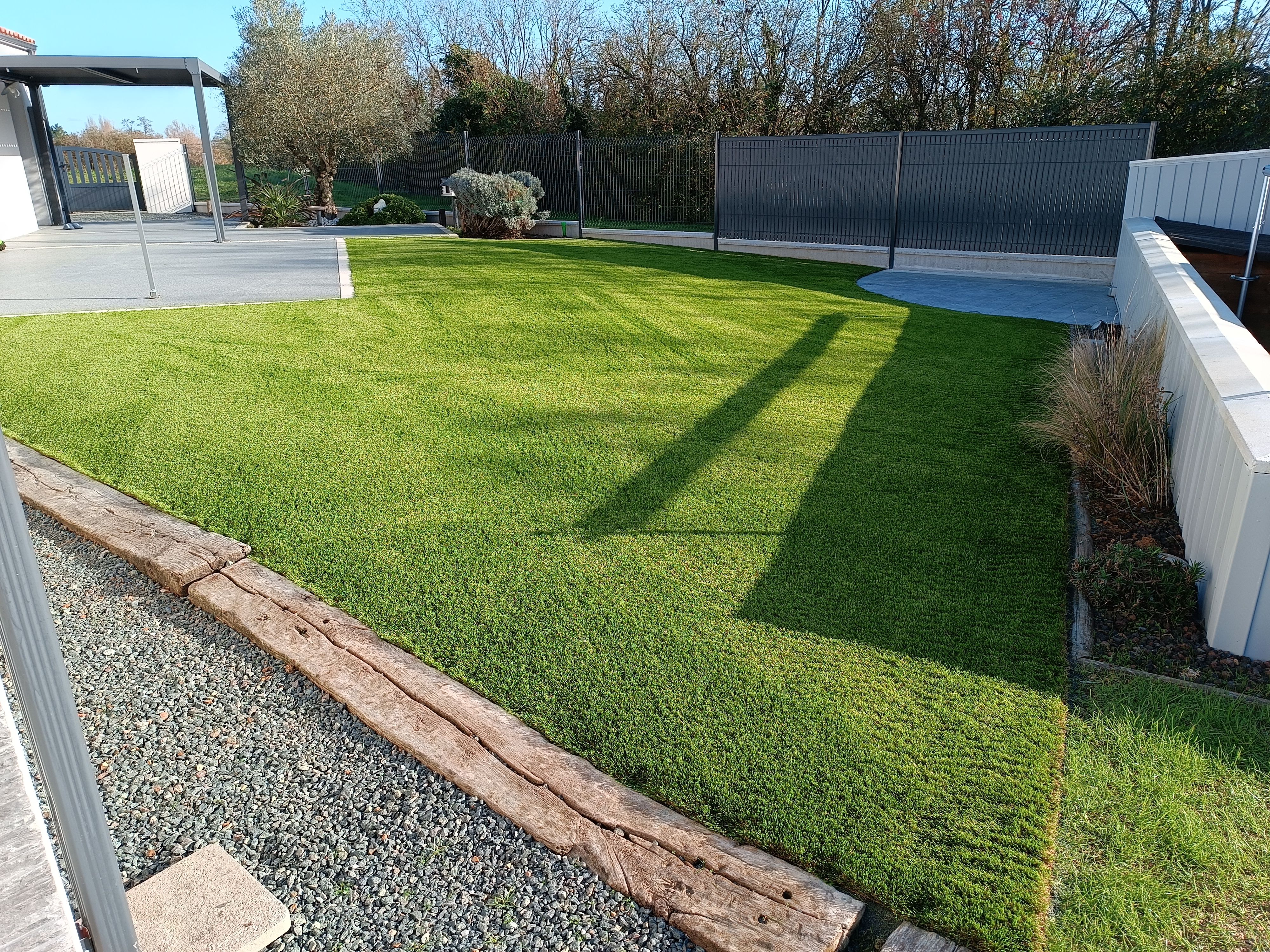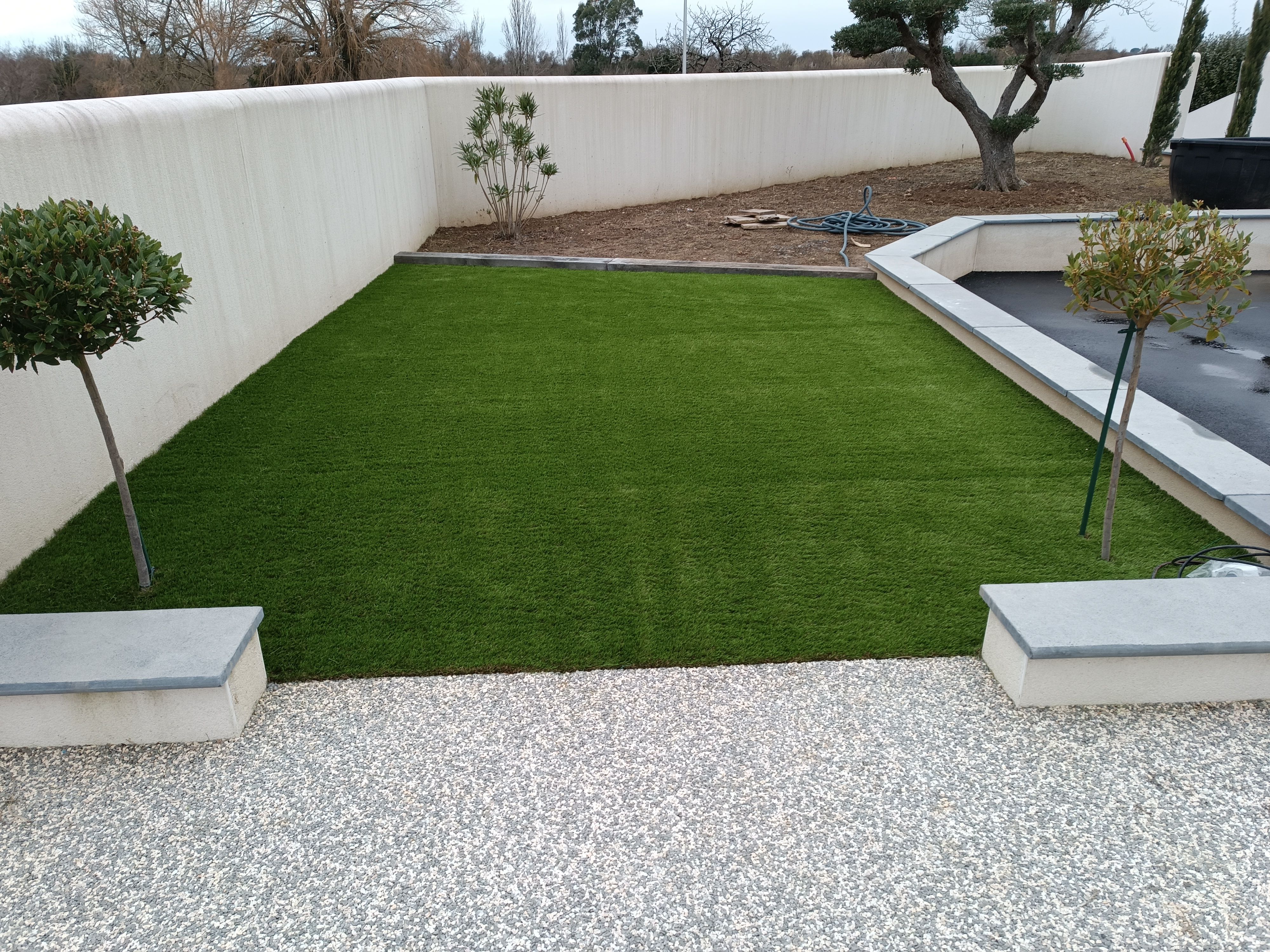 Gazon plaquage / semis Gazon synthétique Terrasses bois Maçonnerie paysagère Nidagravel (plaques stabilisatrices) Plantations Minéralisation ou paillage naturel Taille en tout genre (oliviers, rosiers, haies...)